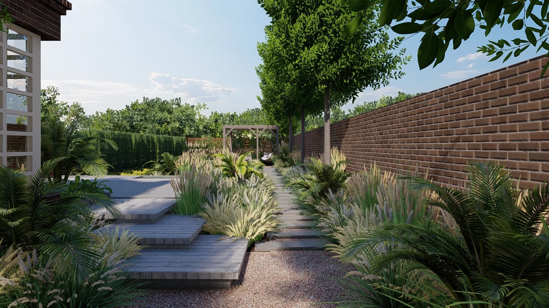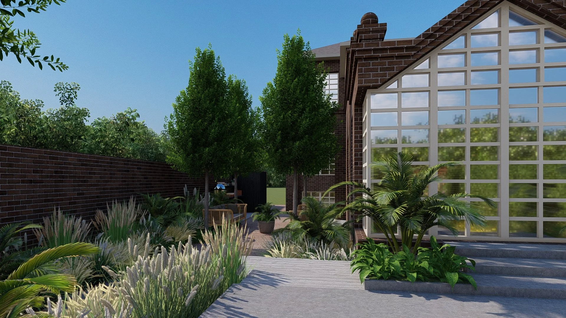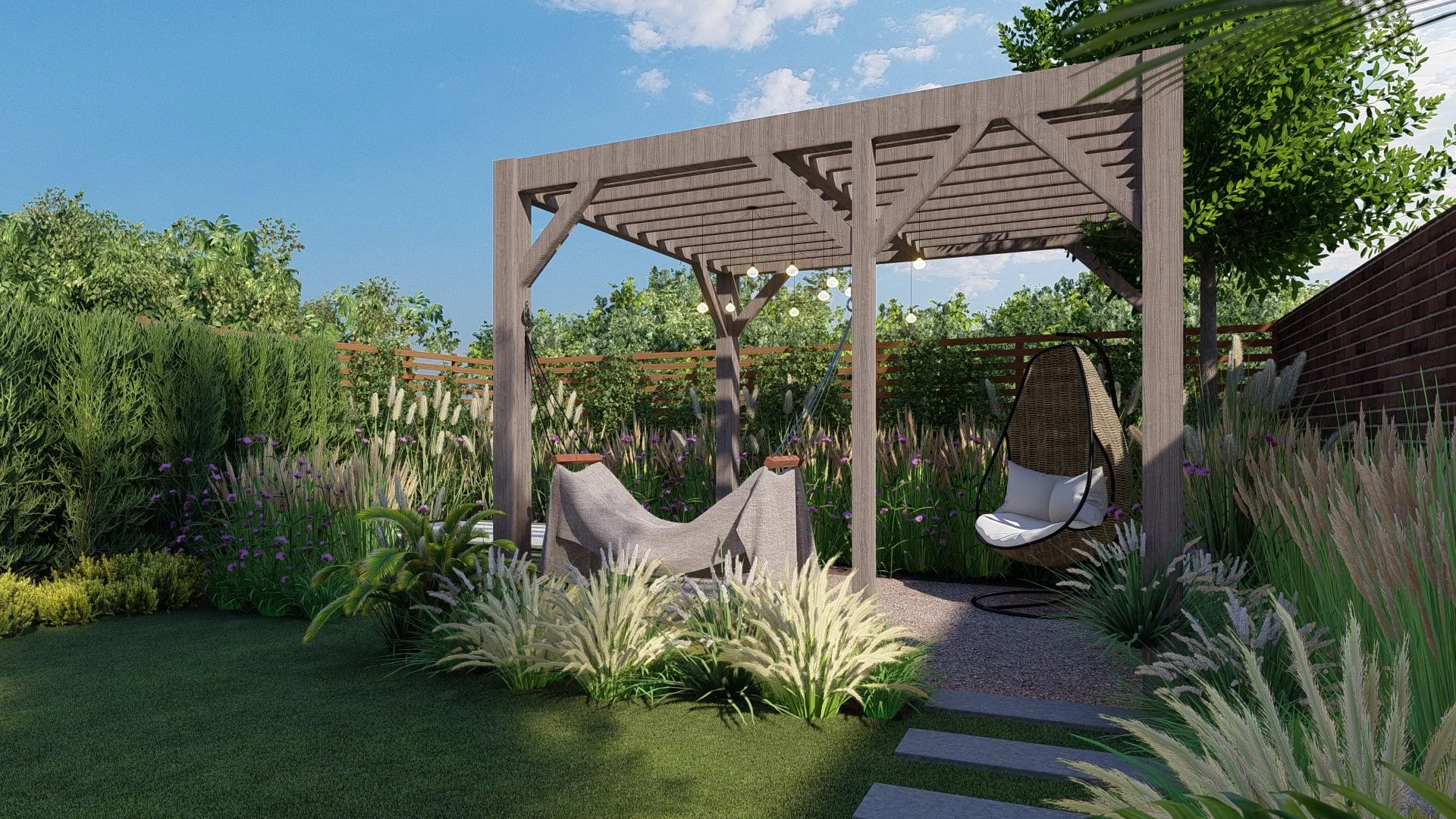 A wrap around patio was created with oversized steps to the extension and down to the lower lawn. A tricky corner area was turned into a feature with large, floating millboard steps up to the raised patio. A gravel courtyard garden was updated with a black kitchen area and path down to a beautiful bespoke timber pergola. Original clay bricks from the house that had been reclaimed were reused in herringbone format to form an outdoor 'rug' under the pergola. Grasses surround all elements of the garden adding a dramatic statement and additional screening.