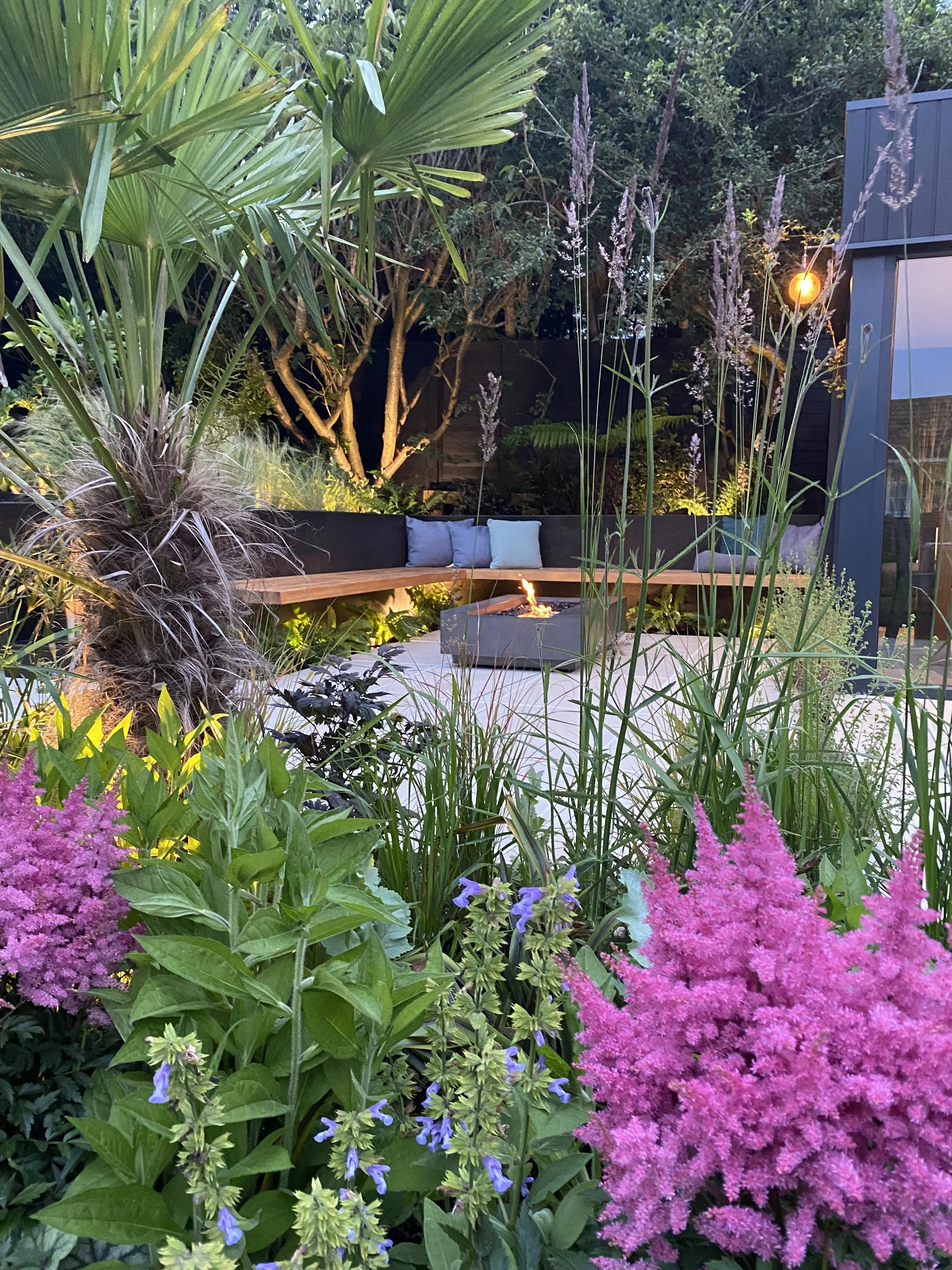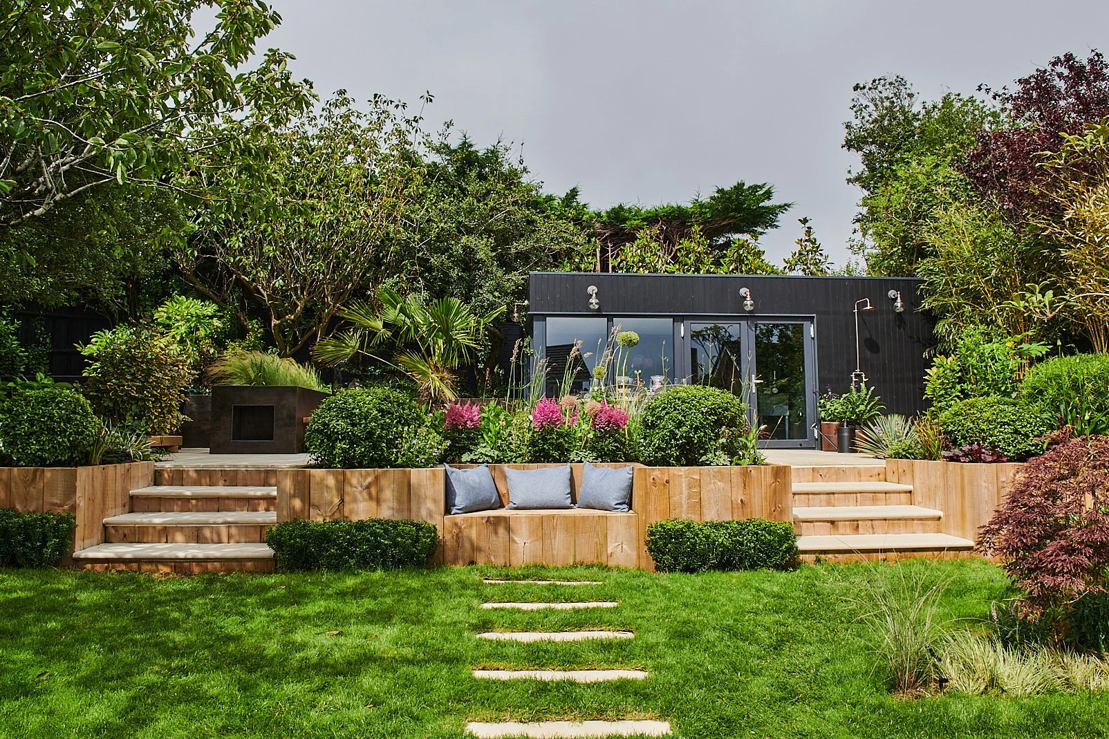 To the right, steps to the top level lead to an independent new studio room with space for an office and bathroom. While to the left, steps to the top level lead to a hidden hot tub and cold plunge pool. A further retaining wall was added that provided the backdrop for an entertaining area with a large L shaped natural wood floating bench surrounding a bioethanol firepit table and abundant underplanting.