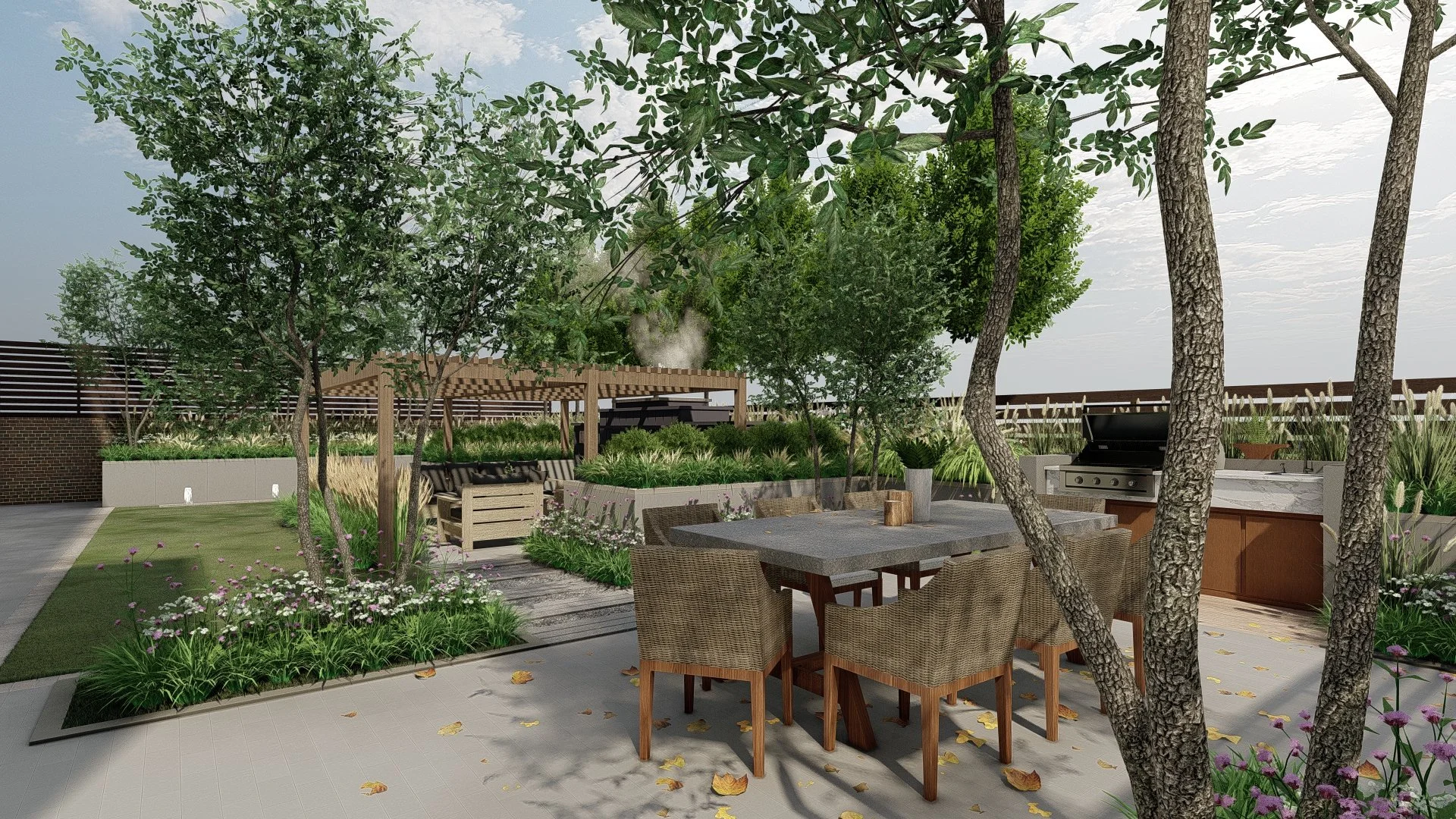 Our solution: We designed a series of outdoor rooms that reflected the design of the new home by Darby Architectural. Each window or door of the home looked on to a corresponding garden room, each separated by a retaining wall that included raised planting beds to create the rooms.